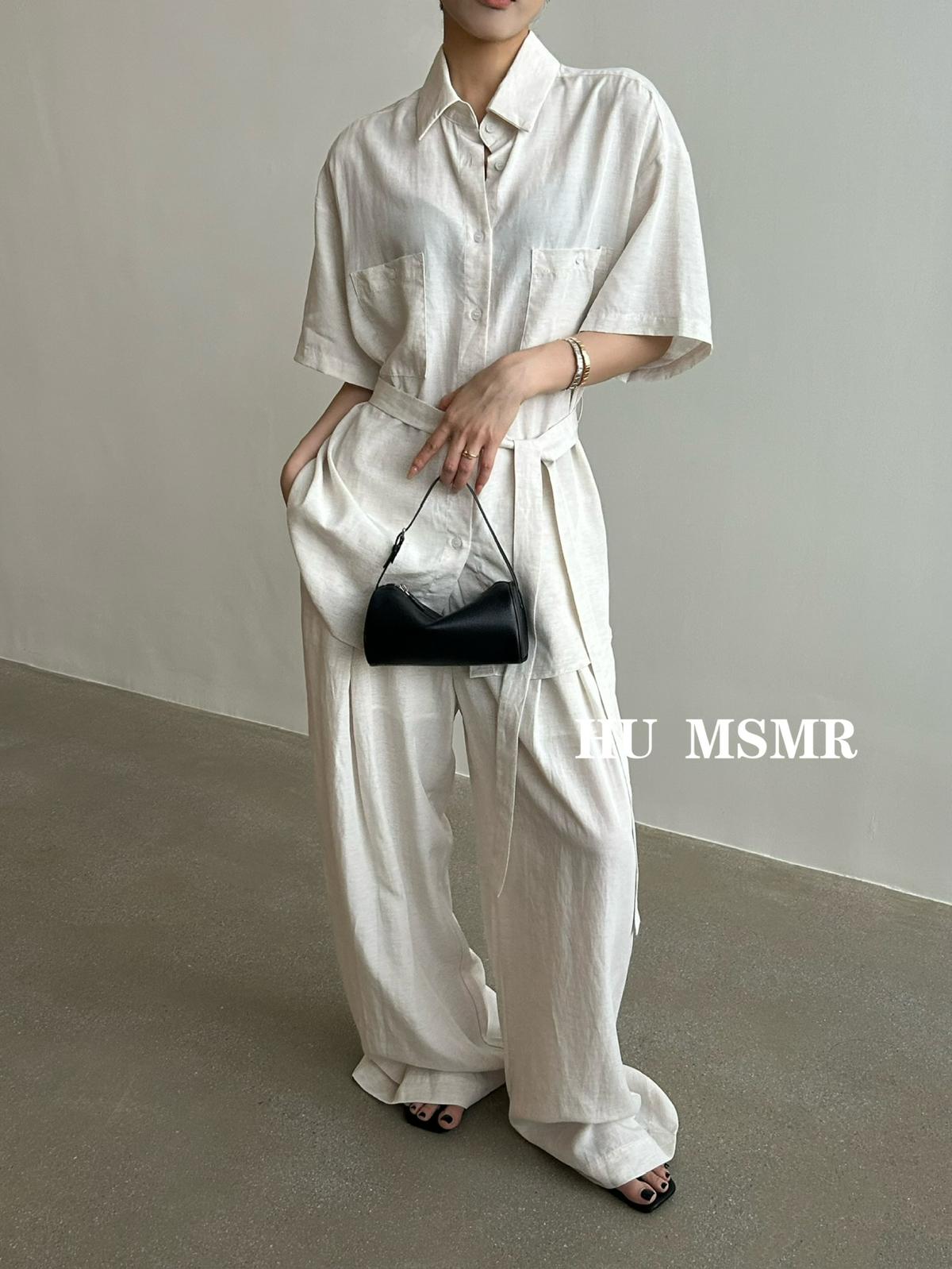 【HUMSMR】清新風純色亞麻短袖襯衫(配腰繩)
