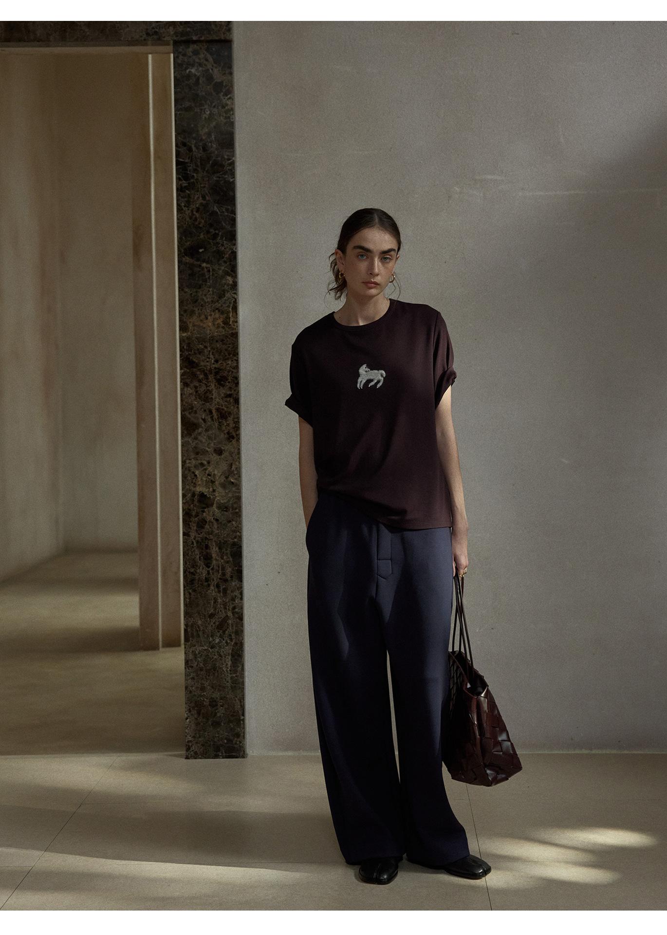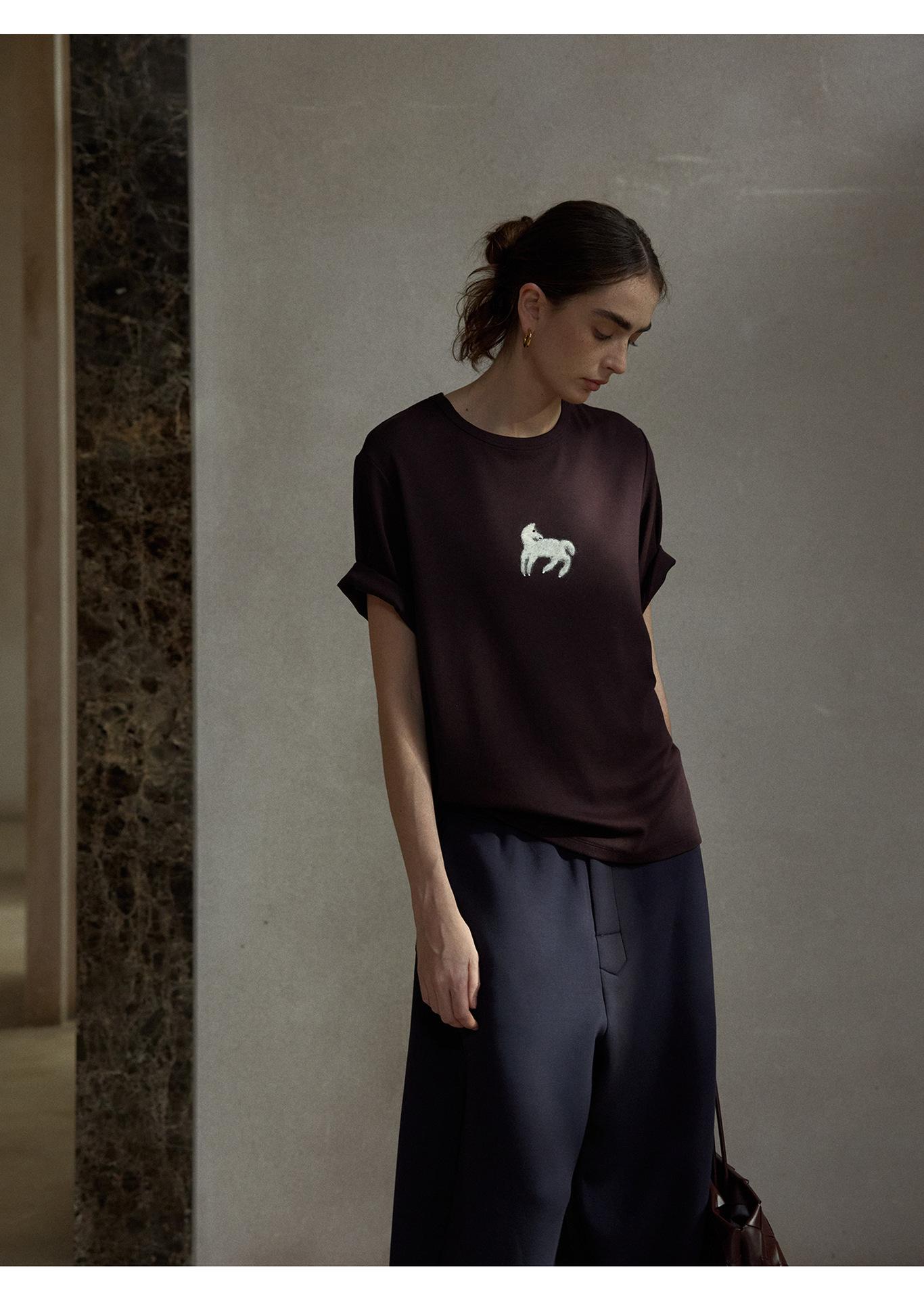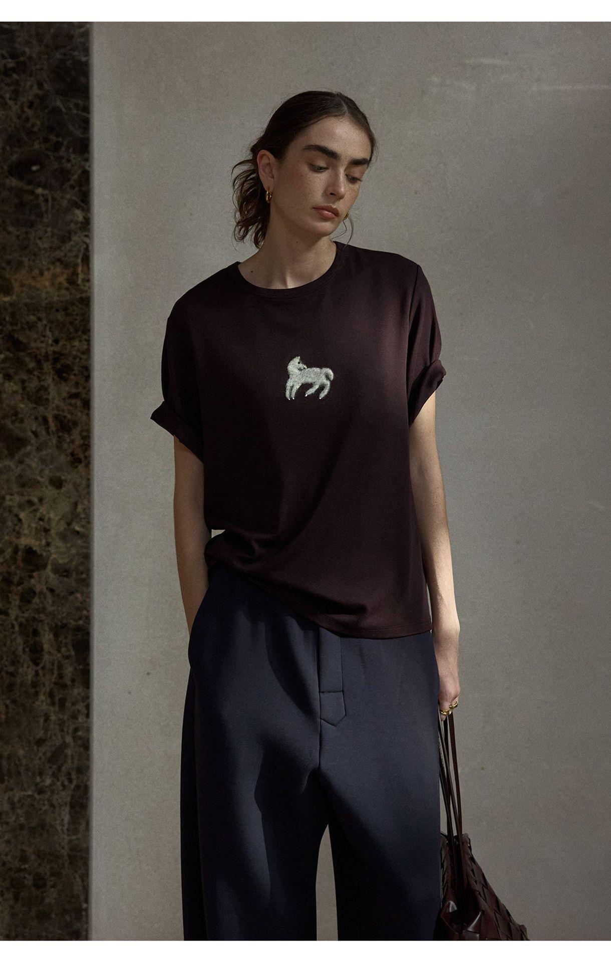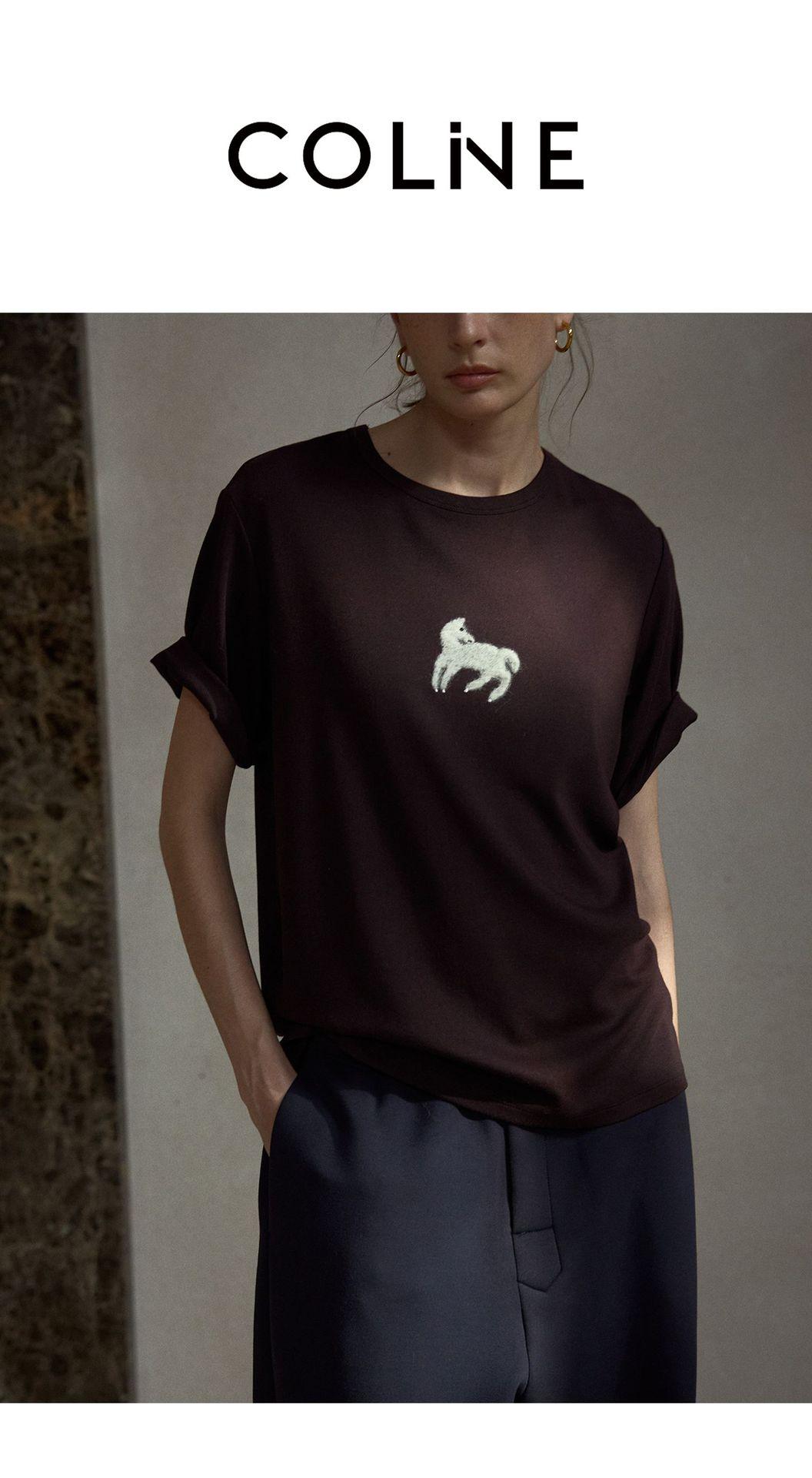 【COLNE】早春新款設計感小馬刺繡羊毛莫代爾毛氈繡T恤女